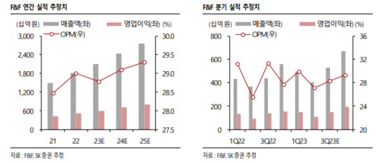 형권훈 SK증권 연구원도 "최근 중국과 내수 업황에 대한 우려가 충분히 주가에 반영됐다"며 "하반기에는 신규 브랜드의 중국 진출 모멘텀이 존재하고, 내수 소비의 기저 부담 완화가 예상되는 만큼 투자매력도 유효하다"고 판단했다. F&F에 대한 투자의견 매수를 유지하고 목표주가는 실적 추정치 하향 조정으로 기존 20만원에서 18만원으로 내려잡았다.
