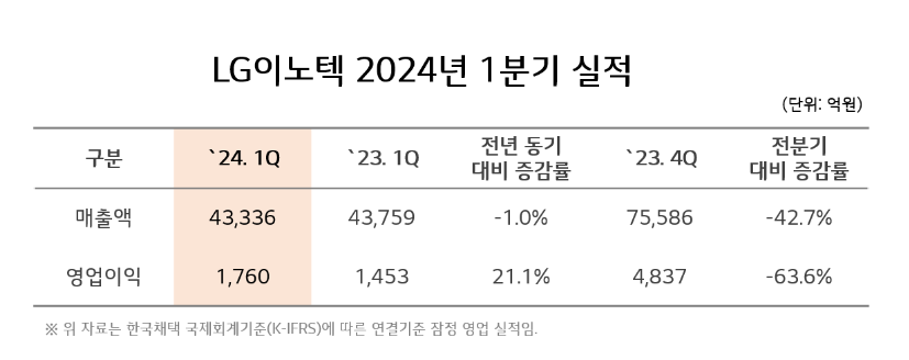 [알파경제=차혜영 기자] LG이노텍이 2024년 1분기 실적발표(K-IFRS)를 통해 ▲매출 4조3,336억원 ▲영업이익 1,760억원을 기록했다고 25일 밝혔다.