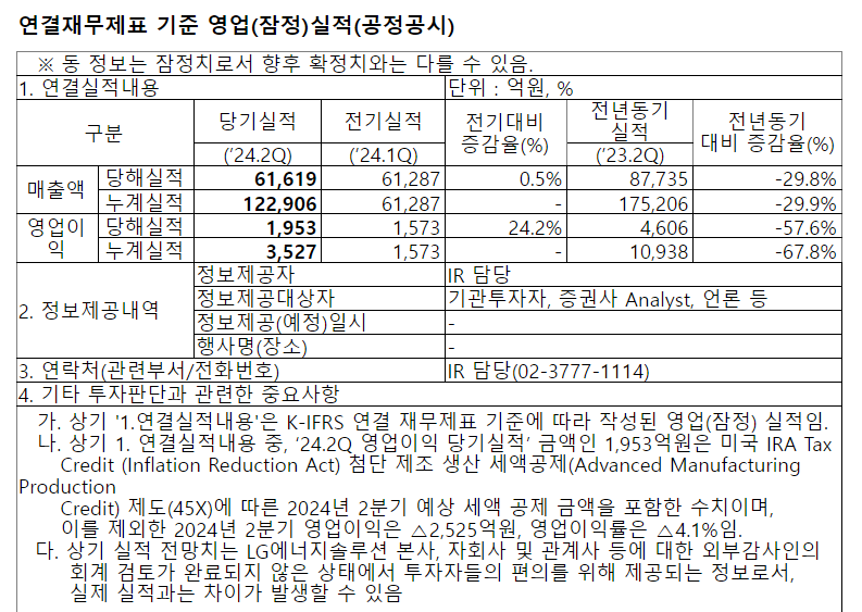 [알파경제=김영택 기자] LG에너지솔루션이 2024년 2분기 부진한 실적을 발표했다.
