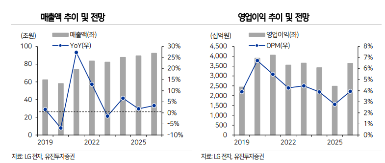 김민경 하나증권 연구원은 "생활가전(HS) 부문은 관세 및 원자재 가격 인상 등 비우호적인 영업환경이 이어졌으나 온라인 판매 강화, 가전 구독 매출 확대 및 비용 절감 등으로 양호한 수익성을 기록했다"라며 "MS 부문은 계절적 성수기에 진입하며 프리미엄 TV 판매량이 증가했으며, VS부문은 믹스 개선이 지속되고 있으며 일부 제품에 대한 판가 인상이 이루어졌다"라고 분석했다.