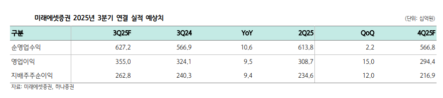 고연수 하나증권 연구원은 "합병이 설사될 경우 기존 주주로서 전략적 협력관계가 강화될 가능성이 높다"라며 "실적 측면에서는 해외부동산 익스포저에 따라 손상부담이 지속되며 트레이딩 부문 성장세는 둔화될 수 있으나, 순영업수익에서 브로커리지 비중이 약 30% 수준임을 고려하면, 현 수준의 거래대금이 유지되는 한 브로커리지 실적은 견조한 흐름을 이어갈 것"으로 예상했다.