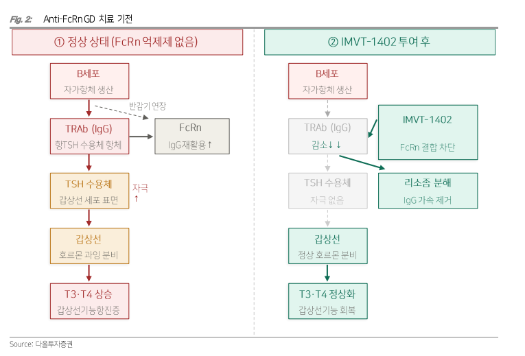 정이수 IBK투자증권 연구원은 "임상 실패에도 오히려 이번 결과는 고용량(680mg) 투여 시 자가항체 IgG 감소율과 갑상선 호르몬 정상화 비율이 함께 높아지는 경향을 확인했다는 점에서, 차세대 물질인 IMVT-1402의 고용량 효능 데이터에 대한 기대를 높일 수 있다"라고 말했다.