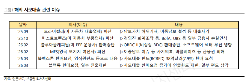 전배승 LS증권 연구원은 "블루아울의 비상장 BDC인 OBDC II의 환매중단 사태에 이어 최근 블랙스톤과 블랙록의 사모대출 펀드 환매요구가 확대되는 등 해외 사모대출 관련 노이즈가 지속되고 있다"라며 "지난 2월에는 영국 모기지업체인 MFS가 이중담보 등 사기의혹으로 파산했으며, 작년 미국의 퍼스트브랜즈, 트라이컬러 등에서 유사한 사례가 나타난 바 있다"라고 전했다.