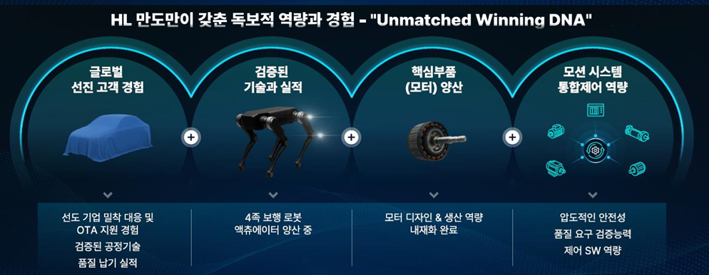 HL만도는 이중화 안전 설계 기술, MiCOSA의 머노이드 정밀 제어 솔루션 적용, 자회사의 모터 생산 역량, 볼스큐류 등 핵심 구동 부품 등으로 주요 경쟁사인 중국 업체들 대비 내구성 및 파워에서 경쟁력을 갖고 있는 것으로 자체 평가했다.