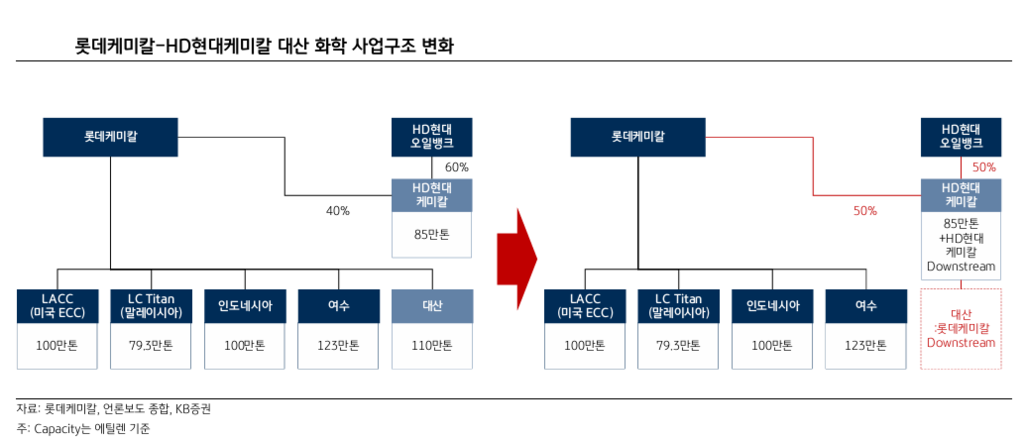 롯데케미칼이 기존 존속 회사 HD현대케미칼 지분을 추가 취득하여 HD현대케미칼의 지분구조는 기존 HD현대오일뱅크 60%, 롯데케미칼40%에서, HD현대오일뱅크 및 롯데케미칼이 각각 50%로 변경된다.