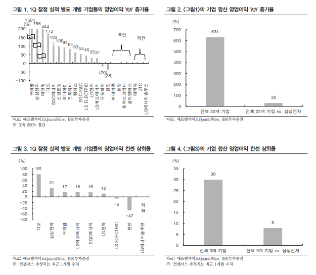 IBK투자증권에 따르면, 실적을 발표한 22개 기업의 합산 영업이익 전년 대비 증가율은 631%로 폭등 수준인데, 여기에는 삼성전자(756%) 효과가 대부분을 기여한다.