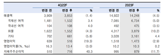| 대한항공 실적 전망 변경 비교. 자료=한국투자증권 |