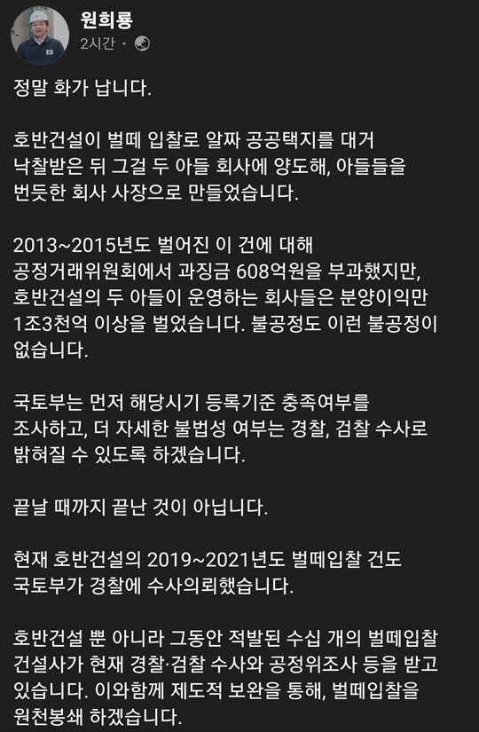 원 장관은 16일 자신의 SNS를 통해 "정말 화가 난다. 호반건설이 벌떼 입찰로 알짜 공공택지를 대거 낙찰받은 뒤 그걸 두 아들 회사에 양도해, 아들들을 번듯한 회사 사장으로 만들었다"라고 밝혔다.