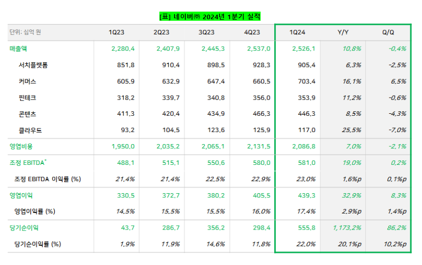 서치플랫폼, 커머스 등 주요 사업 부문의 고른 성장으로 전년 동기 대비 10.8% 증가했으나, 비수기 영향으로 전분기 대비 0.4% 감소한 2조 5,261억 원을 기록했다.
