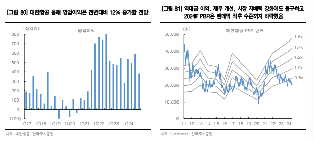 최고운 한국투자증권 연구원은 "대한항공의 현 주가는 2024년 주가순자산비율(PBR) 0.7배로 역사적 바닥 수준"이라며 "올해 이익 성장과 재무 개선, 시장지위 강화를 반영하지 못하고 있어 투자기회"라고 판단했다.