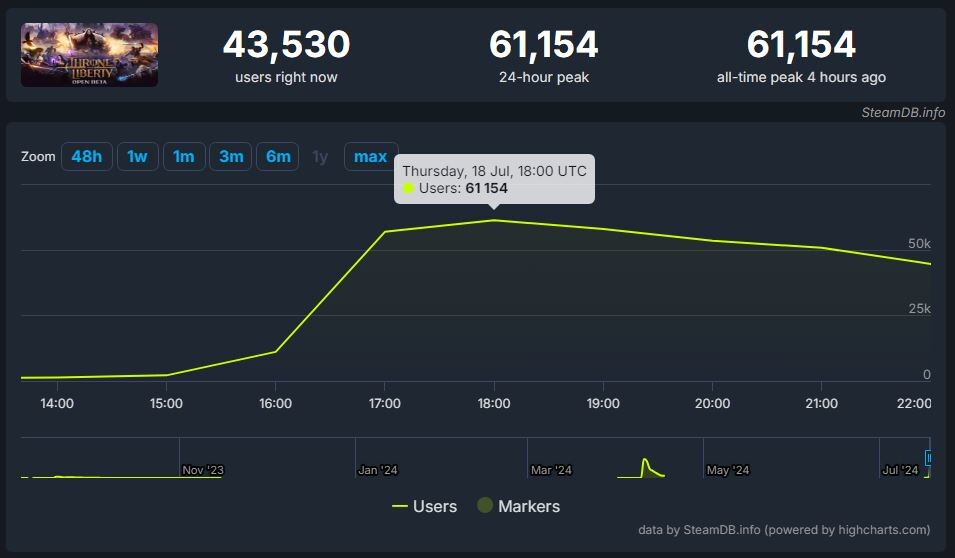TL은 OBT 첫 날 6만1154명의 최고동시접속자를 기록했다. 첫 공개 테스트임에도, 18일 스팀에서 서비스 중인 MMORPG 장르 중 가장 많은 이용자가 모였다.