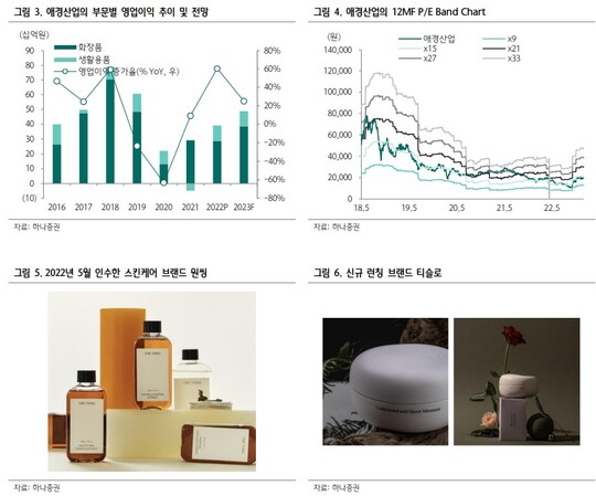 박은정 하나증권 연구원도 "애경산업은 2022년 스킨케어 브랜드 원씽 인수, 바디퍼퓸 브랜드 티슬로 런칭, 에이지투웨니스의 온라인·H&B 전용제품 구축, 루나의 해외 판로 구축 등 브랜드·채널·지역 포트폴리오를 다각화했다"며 "올해는 리오프닝에 따른 중국·내수 홈쇼핑 회복과 다각화 효과로 화장품 부문의 도약이 기대된다"며 투자의견 '매수'와 목표주가 2만4000원을 유지했다.
