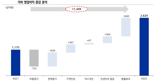 기아는 지난 4분기 영업이익 증가 요인으로 판매증가(+6260 억원), 믹스개선(+670 억원), 가격효과(+3670 억원), 인센티브 절감(+3040 억원), 환율효과(+8400억원) 등을 꼽았다.