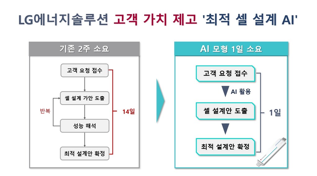 LG에너지솔루션은 배터리 생산의 첫 단추라고 할 수 있는 셀 설계 단계에 AI 기술을 도입함으로써 고객이 요구하는 성능에 대한 최적 셀 설계안을 제시해 고객가치 제고는 물론 업무효율화를 극대화할 수 있게 됐다.