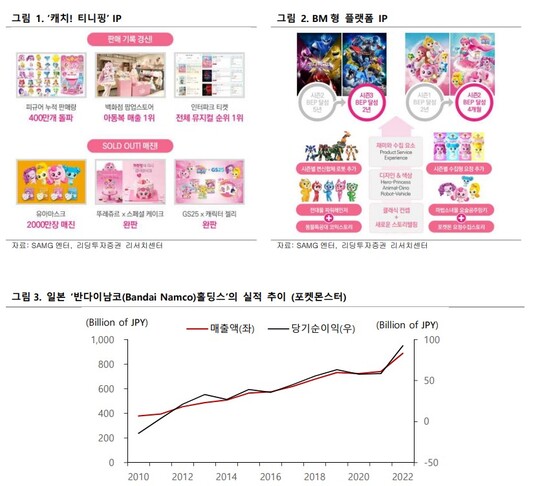 유성만 리딩투자증권 연구원은 "티니핑이 기존 동사의 공급 IP 인 미니특공대 이상의 선풍적인 인기를 끌며 오랜 중국 현지 사업 파트너였던 ‘와우따띠(중국 최대의 미디어그룹)’와의 계약구조도 이전보다 유리하게 변경되고 있다"며 "미니특공대는 계약 구조상 애니메이션 방영과 완구류 제작에 대한 IP 라이센스가 주요 매출원이어서 매출액 규모가 크지 않았는데 티니핑의 성공으로 SAMG 엔터의 지위가 빠르게 격상돼 단순 IP 공급사가 아닌, 중국 사업 전반의 파트너가 될 것"이라고 내다봤다.