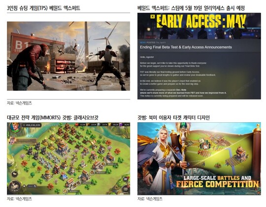 넥슨게임즈는 올해 베일드 엑스퍼트, 퍼스트 디센던트, 갓썸: 클래시오브 갓을 추가로 출시할 예정이다. 베일드 엑스퍼트는 넥슨지티의 FPS 개발 노하우를 기반으로 제작되는 슈팅 게임으로 5월 19일 스팀 얼리억세스로 출시될 예정이며, 퍼스트 디센던트는 슈팅에 RPG 요소가 결합된 루터슈터 장르로 뛰어난 그래픽을 보유하고 있다. 갓썸은 북미와 유럽을 타겟팅하여 개발되는 대규모 전략게임인 MMORTS로 하반기 출시가 전망된다.