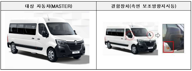 르노 MASTER 모델의 경우 측면 보조방향지시등의 광도가 최소 기준을 만족하지 못해 안전기준에 부적합한 것으로 판명됐으며, 이에 따라 이달 7일부터 시정조치가 시작됐다. 해당 차량은 총 1830대이다.