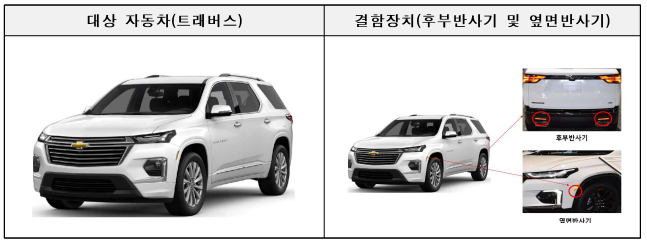 지엠에서 제작한 트래버스 모델은 159대에 대해 후부 및 옆면 반사기의 반사 성능이 최소 기준을 만족하지 못해 이달 12일부터 시정조치를 진행하고 있다.