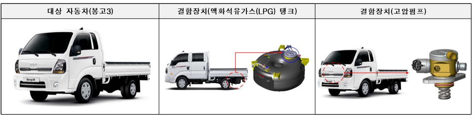 같은 회사의 봉고3 모델에서는 액화석유가스(LPG) 탱크 제조 불량으로 1만1784대, 엔진부 고압펌프 제조 불량으로 112대를 대상으로 오는 18일부터 시정조치가 이루어진다.