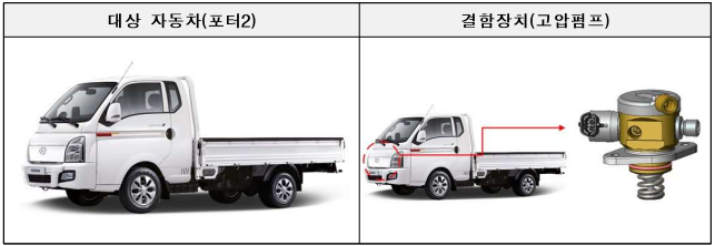 현대 포터2 모델의 경우 엔진부 고압펌프 제조 불량으로 인해 오는 18일부터 시정조치에 들어간다. 해당 차량 수는 총 110대이다.