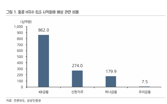 김현수 상상인증권 연구원은 "이는 홍콩 ELS 판매에서 실제로 거둔 수수료수익(판매액의 약 1% 수준)을 크게 웃도는 금액이지만, 이미 각 사가 사적화해비용 및 관련 충당부채를 인식한 점을 감안하면 상당 부분은 규정상 허용 범위 내에서의 벌점 부과 성격에 가까울 것"으로 예상했다.