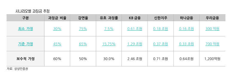 기준 시나리오(유효 과징률 15.75%)에서는 KB 1조2900억원, 신한 3700억원, 하나 3300억원, 우리 100억원으로 합산 약 2조원까지 높아진다.
