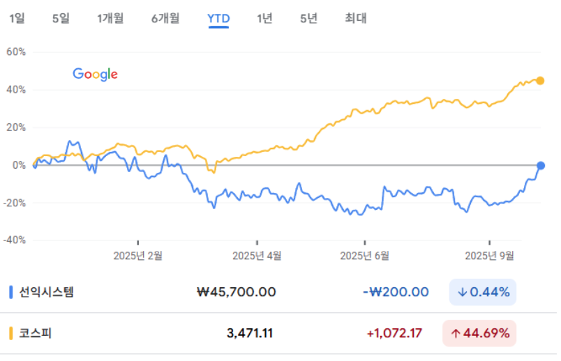 지난 25일 한국거래소 종가기준으로 선익시스템의 YTD는 -0.44%에 그쳤다. 코스피는 44.69%로, 선익시스템이 약 45%의 수익률 하회를 기록했다.