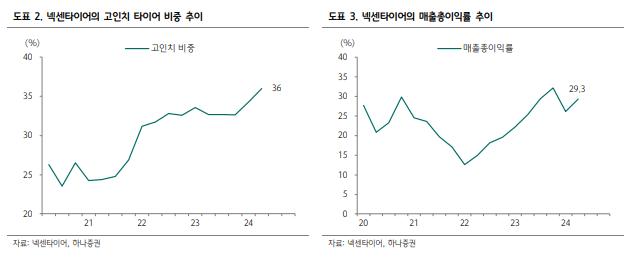하나증권에 따르면, 넥센타이어의 2분기 매출액은 전년 대비 10% 상승한 7638억 원, 영업이익은 629억 원으로 69% 늘어 시장 예상치를 웃돌았다. 물량 증가와 평균판매단가(ASP) 안정, 그리고 환율 상승으로 매출액이 분기 사상 최고를 기록했다. 지역별로는 매출 비중이 25%와 40%로 높은 북미와 유럽에서 호조를 보였다. 픽업 트럭 및 EV 모델향 공급으로 OE매출액이 증가했고, RE에서는 물류 차질이 있었지만 윈터타이어와 같은 고인치 위주로 성장했다.
