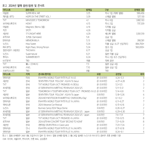 특히 2분기 들어 BTS(RM), 세븐틴, TXT, 엔하이픈, 뉴진스, &TEAM, 보이넥스트도어 등 각 레이블별 아티스트들은 신보 발매와 함께 활동을 재개했다. 1월 데뷔한 보이그룹 TWS는 6월 컴백을 확정했고, 미국 현지화 걸그룹 KATSEYE도 데뷔를 앞두고 있다.