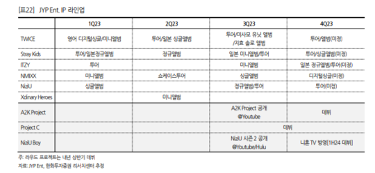 박수영 한화투자증권 연구원은 "JYP Ent.의 주가는 최근 고점 대비 25% 하락했지만 펀더멘털에 변화는 없다"며 "오히려 서구권에서의 IP 대중성 확장에 따른 공연과 MD 업사이드는 더 커지고 있어 지속해서 업종 내 탑픽(Top Pick)으로 제시한다"고 밝혔다.