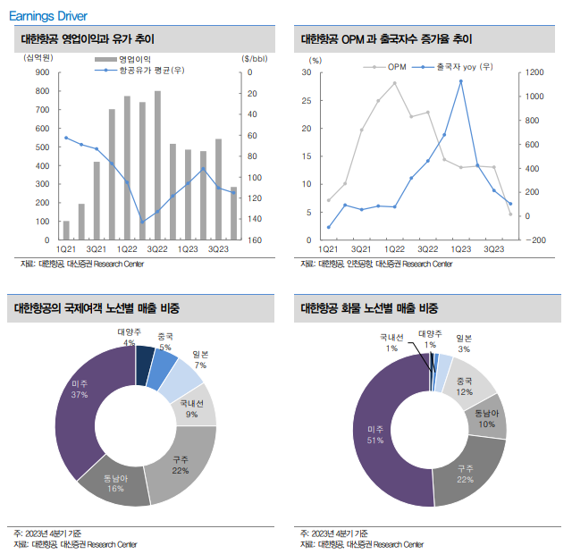 양지환 대신증권 연구원은 "견조한 국제여객 수요가 유지되고 있고, 중국발 미주향 직구 물량 증가로 항공화물 부문의 수송량이 늘어나고 있다"며 "2024년 1분기 항공유 가격도 $102.6/bbl로 전년동기대비 약 3.2% 하락한 점과 연결 자회사인 진에어도 깜짝 실적을 기록할 것으로 전망되는 점도 영향을 줬다"고 판단했다.