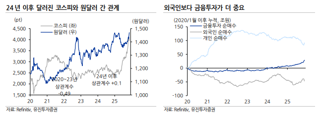 허재환 유진투자증권 연구원은 "원화 가치가 하락하는 것은 외국인 투자가들에게 부정적"이라면서도 "하지만 2024 년 이후 국내 주가와 원달러 관계는 변했다"고 판단했다.