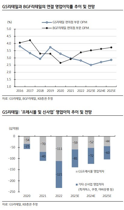 KB증권에 따르면, GS리테일의 2023년 연결 영업이익은 전년대비 25% 증가할 것으로 예상되는데, 편의점 및 홈쇼핑 부문의 영업이익은 각각 3%, 17% 하락할 것으로 추정되는데 반해, 신사업들의 적자 개선이 전사 이익 성장을 견인할 것으로 전망된다.