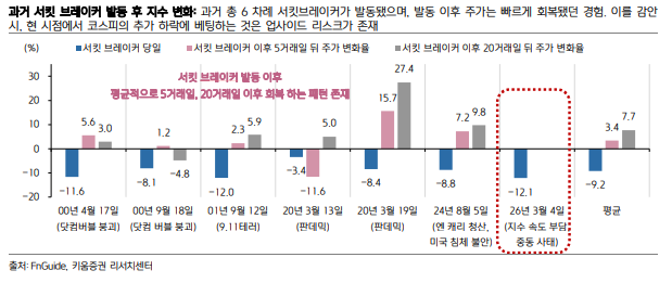 과거 서킷 브레이커 발동 후 코스피가 회복세를 보였던 패턴이 존재하며, 걸프전, 러-우 전쟁 당시와는 다르게 일시에 주가 상으로 전쟁 리스크를 반영해버린 측면이 있기 때문이란 분석이다.