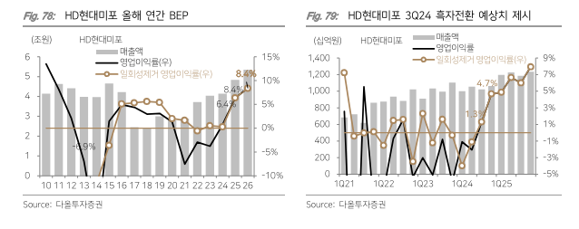 이어 "2024년에 손익분기점(BEP) 안팎이어서 2026년의 영업이익률을 대형 조선사들의 10% 안팎보다 낮게 8.4%로 두고도, 2026년 주가수익비율(PER)은 7배에 불과해 저평가됐다"고 판단했다.