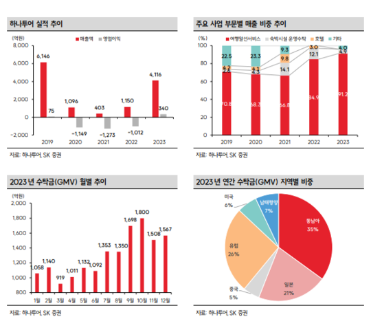 하나투어는 2023년 매출액 4116억원으로 전년 대비 258% 증가하고, 영업이익은 340억원으로 흑자전환을 기록하며 코로나19 로 인한 후유증을 완전히 떨쳐냈다는 평가다.