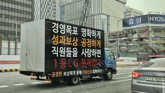 알파경제가 이날 서울 여의도에서 촬영한 LG에너지솔루션 시위 트럭에는 “경영목표 명확하게, 성과보상 공정하게, 직원들을 사랑하면 1등 LG문제 없다”라는 문구와 함께 “공정한 보상체계 통해 직원신뢰 회복하라”는 내용이 담겼다.
