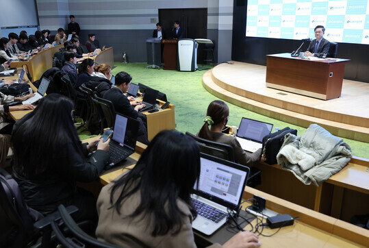 | 태영건설의 워크아웃(기업재무구조개선) 신청 관련 채권단 설명회가 열린 3일 오후 서울 산업은행 본점에서 강석훈 산업은행 회장이 취재진의 질문을 받고 있다. (사진=연합뉴스) |