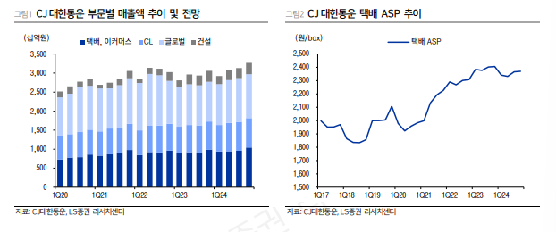 택배·이커머스 사업부의 경우 소형화물 중심의 화물 믹스(Mix) 재편과 올해 절대적 판가 인상의 어려움으로 인한 평균판매단가(ASP) 하락에도 이커머스 중심의 물동량 확대가 실적을 견인했다는 평가다.