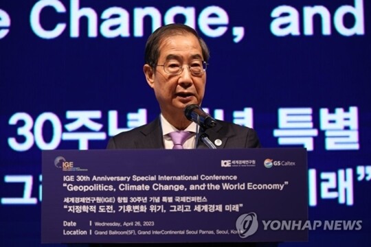 | 한덕수 국무총리가 26일 오전 서울 강남구 그랜드 인터컨티넨탈 서울 파르나스에서 열린 세계경제연구원(IGE) 창립 30주년 기념 특별 국제콘퍼런스에 참석해 축사하고 있다. (사진=연합뉴스) |