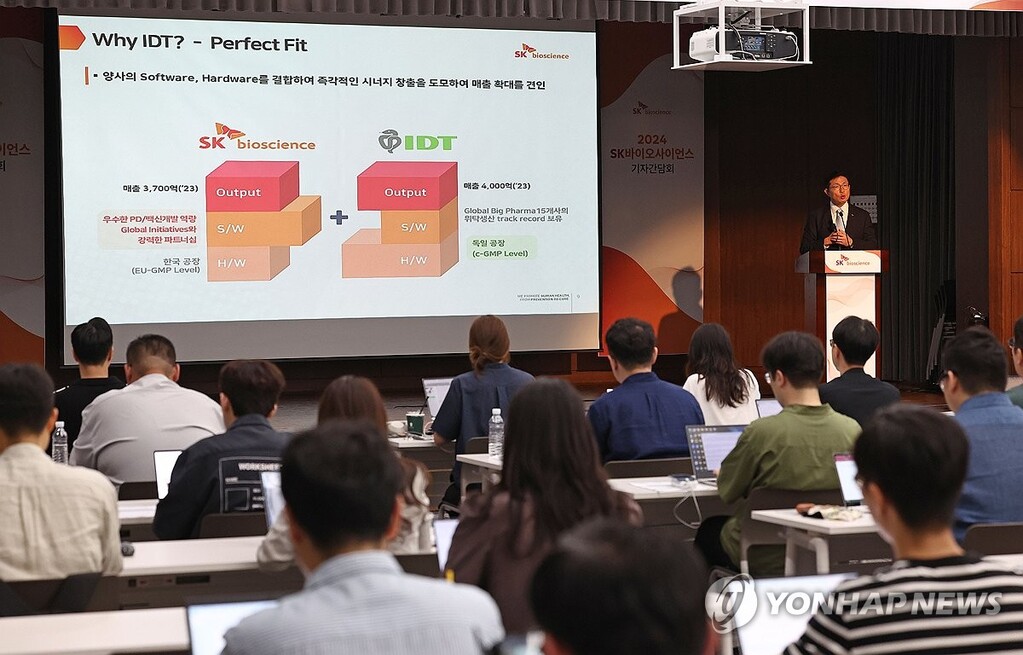 안재용 SK바이오사이언스 사장은 27일 오전 서울 중구 은행회관에서 열린 ‘SK바이오사이언스 CEO 기자간담회’에서 “IDT 바이오로지카 인수를 앵커로 삼아 적극적으로 추가적인 M&A를 할 생각”이라고 강조했다.