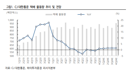 배세호 연구원은 "CJ 대한통운의 수익성 위주의 화물 처리 및 쿠팡 등 경쟁사의 성장으로 전년 대비 감소 추세가 지난해 1분기부터 이어지고 있지만, 2024년 택배 물동량은 다시 증가할 것"이라고 예상했다.