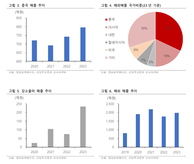 중국법인은 올해 1분기 전년 대비 24.6%의 성장을 기록했다. 러시아 법인은 올해 1 분기 매출액이 중국을 넘어섰으며, 화장품 및 건기식(비타민, 유산균)이 골고루 높은 증가세를 기록하며 러시아 법인은 올해 1 분기 전년 대비 320%의 높은 매출 성장을 기록했다.