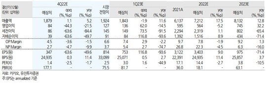 정의훈 유진투자증권 연구원은 "목표주가 상향은 올해 카카오 톡비즈의 이익 성장과 상장 자회사인 카카오페이, 카카오뱅크 등의 지분가치 상승에 기인한다"며 "지난해 화재사고로 인한 추가적인 비용이 발생할 가능성은 적어 보이며, 불안정한 매크로 상황도 여전히 지속되고 있지만 주가에는 충분히 반영됐다고 판단한다"고 밝혔다.