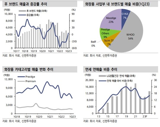 LG생활건강은 1분기 연결 기준 매출액이 전년 대비 2% 늘어난 1조6837억원, 영업이익 17% 감소한 1459억원으로 추정치에 거의 근접했다. 유독 생활용품과 음료 부문의 마진율이 저조했고, 화장품 마진율은 부진폭을 줄여나가는 추세라는 평가다.