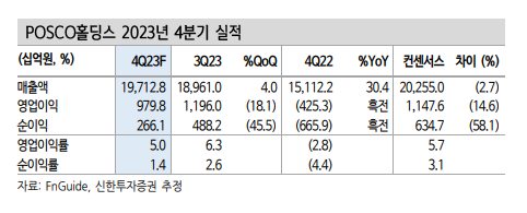 신한투자증권에 따르면, POSCO홀딩스의 4분기 매출액은 19.7조원으로 전분기 대비 4% 늘고, 영업이익은 9798억원으로 전분기 대비 18% 감소하며 기대치를 밑돌 것으로 추정된다.