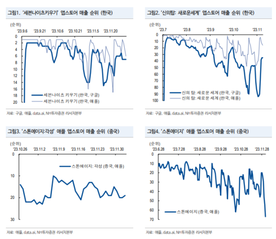 6월 ‘스톤에이지(중국)’, 7월 ‘신의탑: 새로운세계’, 9월 ‘세븐나이츠키우기’, 10월 ‘스톤에이지:각성’의 연이은 성공으로 4분기 영업이익 흑자 전환이 전망된다는 분석이다.