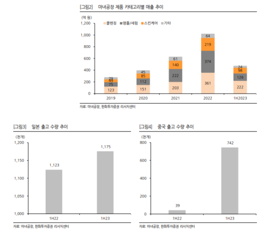 한유정 한화투자증권 연구원은 "기대 대비 성장이 약했던 지역은 일본과 중국으로 일본은 현지 탑티어(Top Tier) 광고 모델 기용 및 일본 전용 제품 출시가 예정되어 있고 돈키호테, Loft 등 POS 기준 4500여개 입점도 완료되어 하반기 일본 매출은 성장 전환할 것"이라고 전망했다. 불안정한 시장 환경으로 주요 마케팅 활동이 하반기로 지연된 중국 역시 상저하고 실적 흐름이 예상된다.