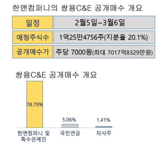 현재, 한앤코는 쌍용C&E의 지분 79.9%를 보유하고 있다. 이번 공개매수로 쌍용C&E 지분 전량을 확보한 뒤 상장폐지에 나설 것으로 알려졌다.