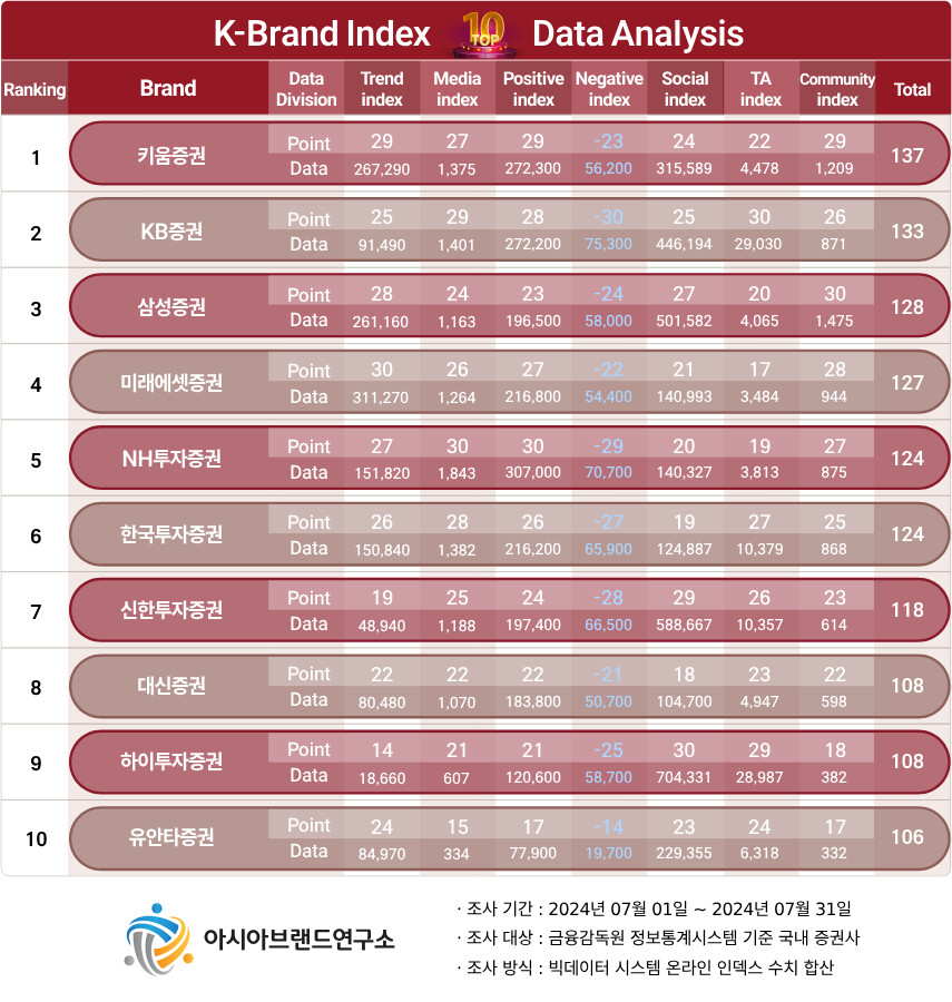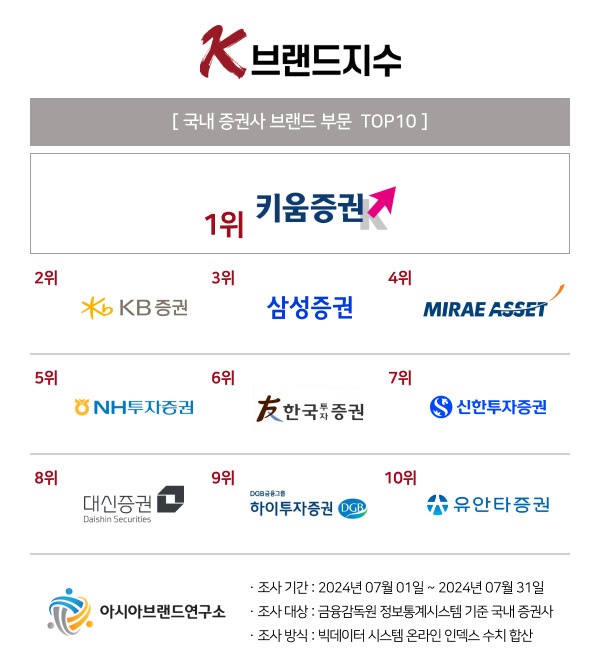 ‘K-브랜드지수’ 증권사 부문은 ▲1위 키움증권에 이어 ▲KB증권(2위) ▲삼성증권(3위) ▲미래에셋증권(4위) ▲NH투자증권(5위) ▲한국투자증권(6위) ▲신한투자증권(7위) ▲대신증권(8위) ▲하이투자증권(9위) ▲유안타증권(10위) 등이 TOP10에 등극했다.